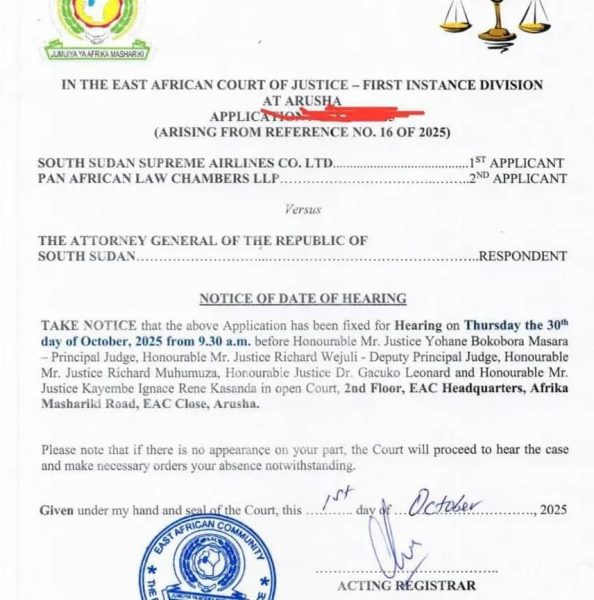 The case, Reference No. 16 of 2025, pits South Sudan Supreme Airlines Co. Ltd. and Pan African Law Chambers LLP against the government in what could become one of the largest commercial disputes ever heard before the regional tribunal.