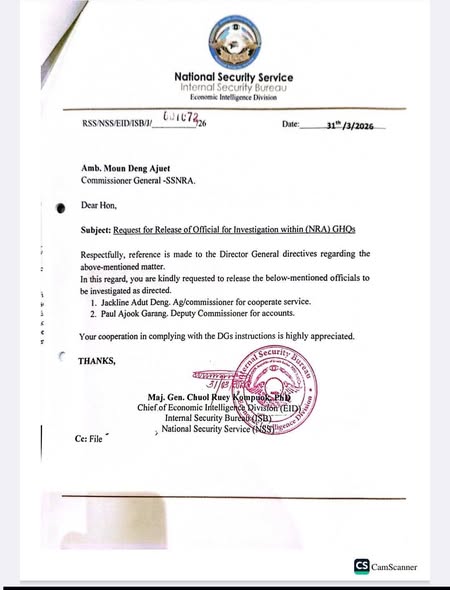 In a letter dated April 7, 2026, and addressed to Commissioner General Moun Deng Ajuet, the NSS requested the release of Mr. Benjamin Yom Bol, Deputy Commissioner for Administration and Finance, for questioning.